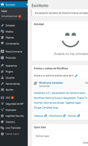 Sencillo, verdad? Pues así debería de quedar siempre, acorde al entorno wordpress, sin excesivas nuevas entradas en el menú ni colores que rompan el diseño con el fin de destacar, sin previamente “consultar” con el usuario. En la siguiente captura podeis ver un menú repleto de opciones que han salido ahí por las buenas, sin preguntar, habrá a quien no le importe pero personalmente pienso que complica la utilización en el dia a dia.