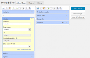 Para utilizar Admin menu editor basta con instalar el plugin desde el instalador típico o de forma manual… es indiferente, una vez instalado podemos acceder a las configuraciones del plugin desde la sección ajustes/menu editor, la interfaz que nos encontramos es la siguiente: