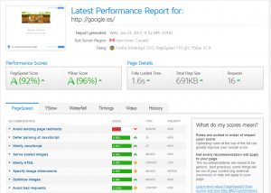 Pingdom tools es una de las más famosas, entre muchas otras herramientas como monitorización y analítica, nos ofrece gratis un análisis de la carga de nuestra página web, nos destaca muchísima información, sobre todo un timeline de la carga de todos los elementos que componen nuestra web, pudiendo observar cuales son los puntos críticos que debemos analizar con más cautela. Pero sin duda lo que más le gusta a la gente, es la sencillez con la que nos muestra a primera vista los datos más relevantes, en este caso he escogido google.es para el análisis, como posible debate… si tanto le importa a google la velocidad de carga, ¿por que ni ellos tienen un 100 de score? ¿No será que no es tan importante la cantidad sino la calidad…?